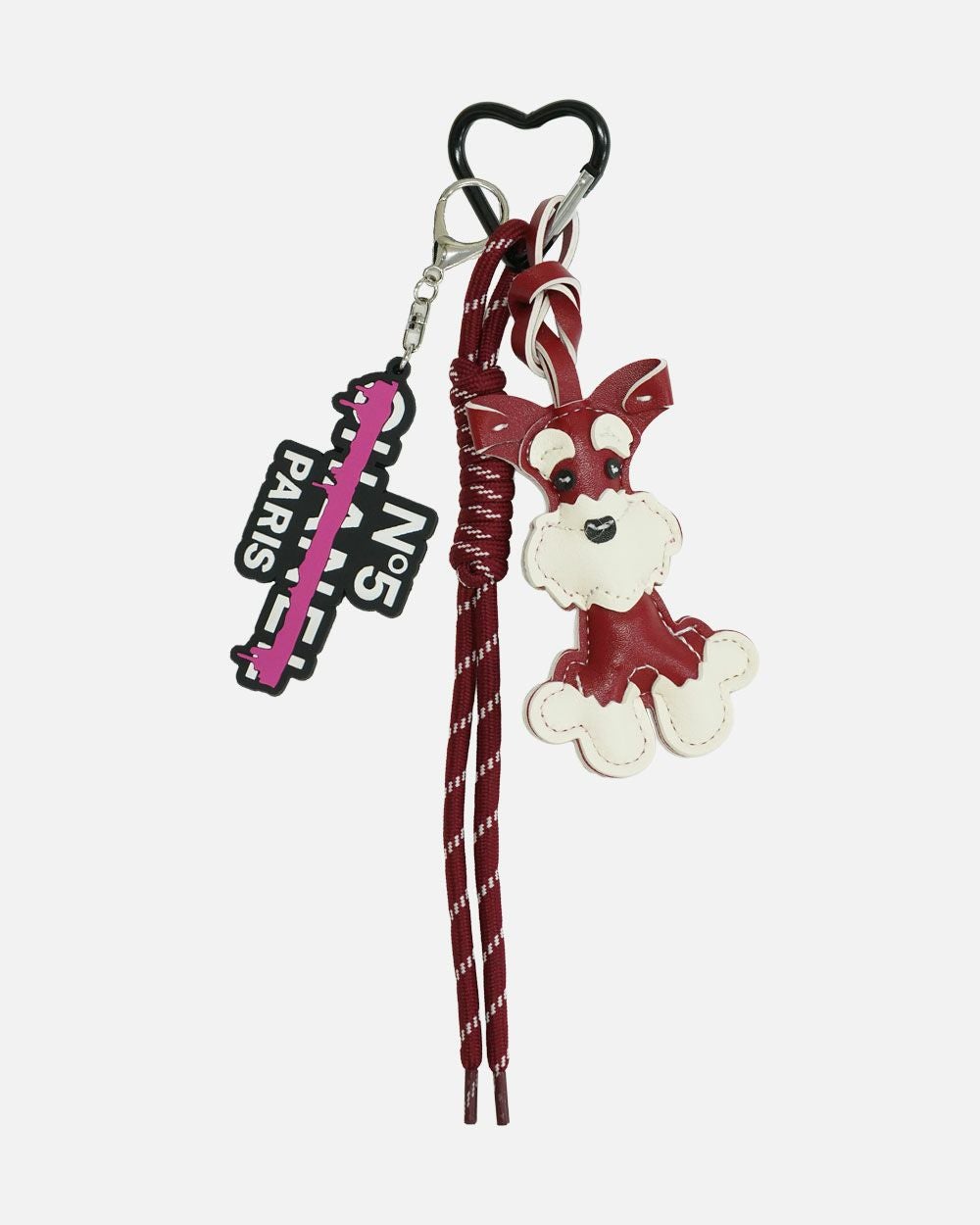 目元やひげ部分の立体的なデザインが表情豊かで、ハート型カラビナと編み紐のアクセントが遊び心をプラス。