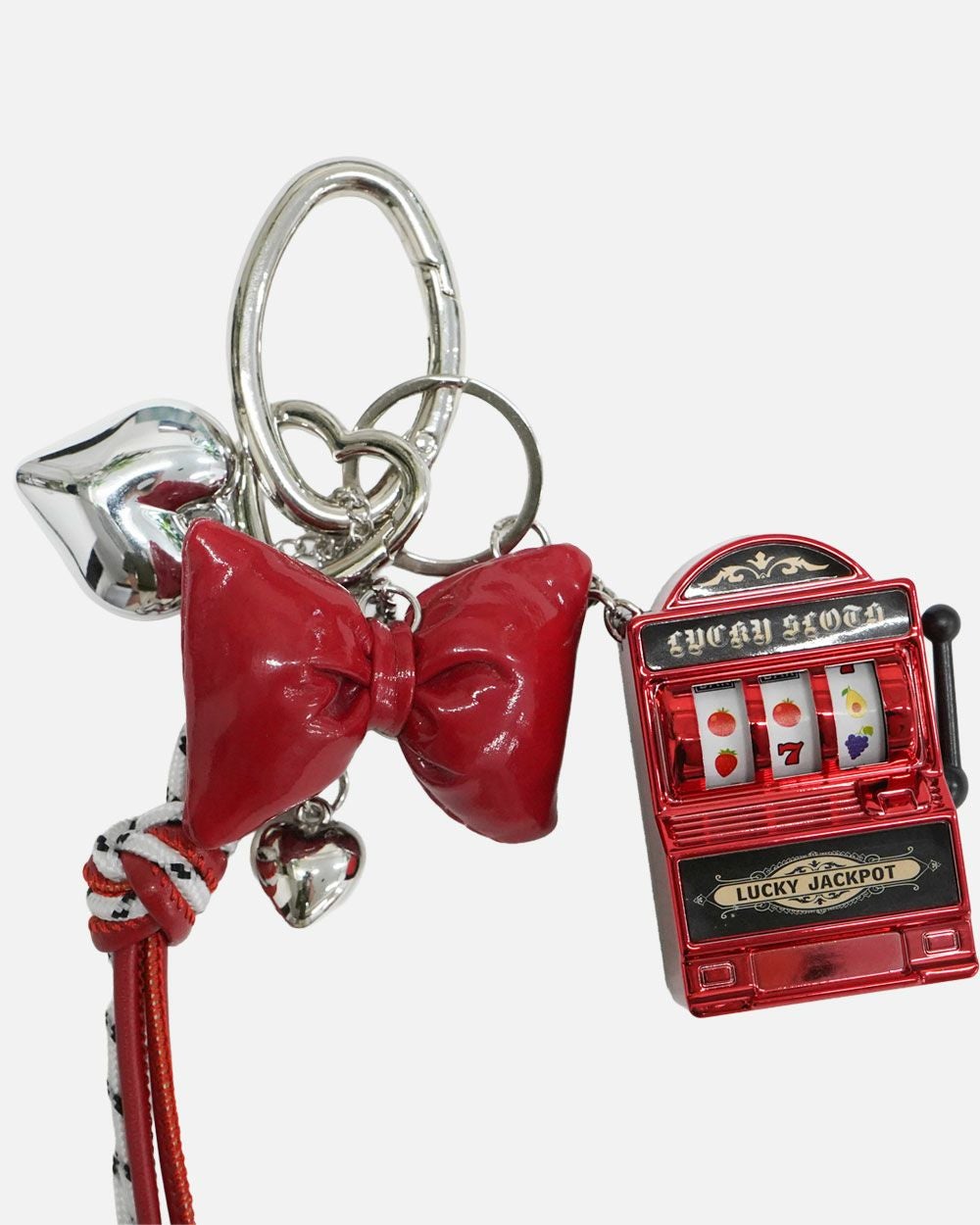 ・デザイン:スロットマシーン型チャーム+リボン+ハート+ロープ状ストラップ