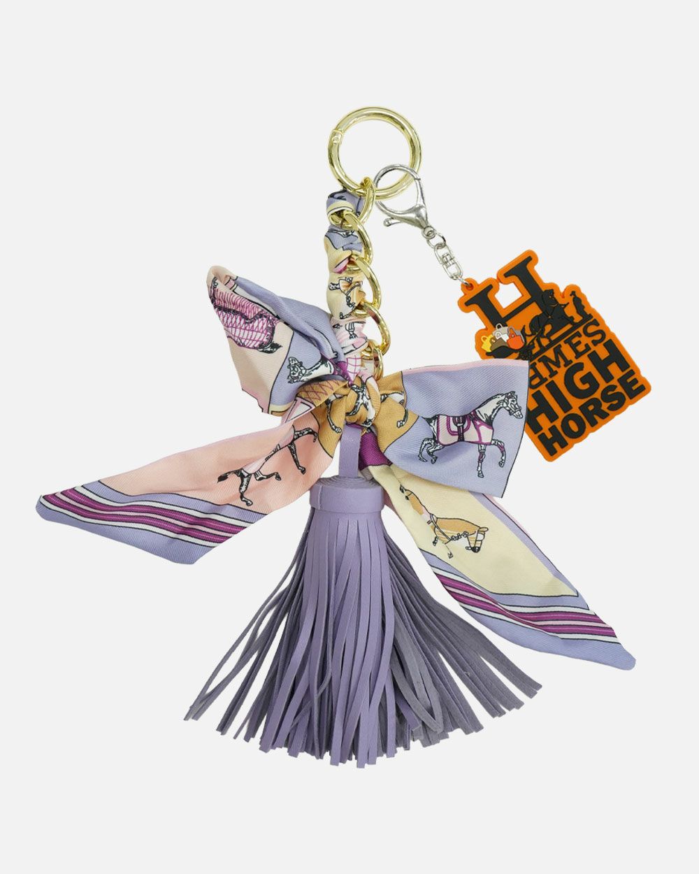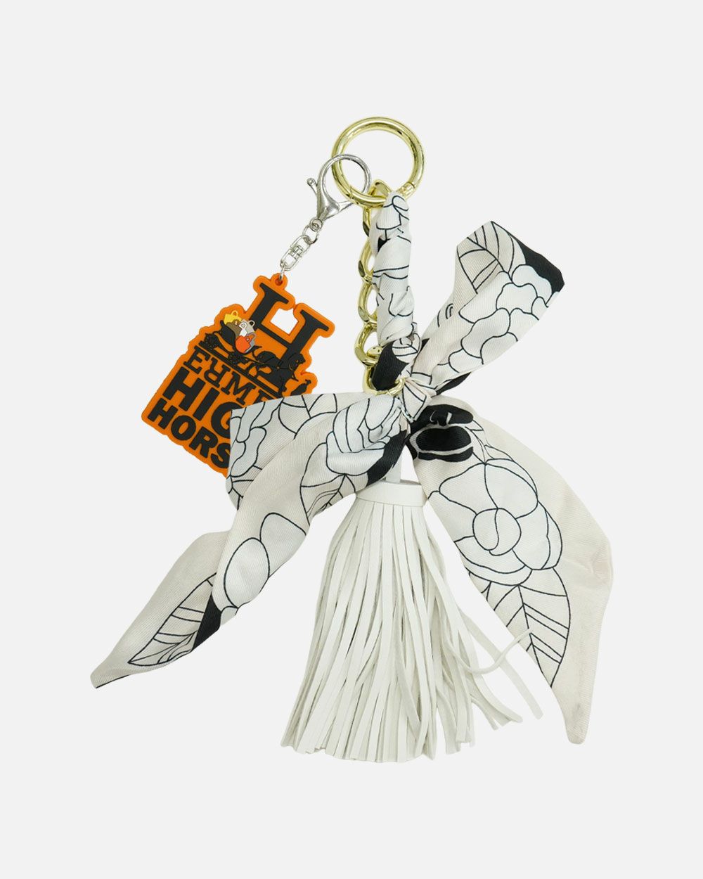 華やかなプリントスカーフと、揺れるフェイクレザータッセルを組み合わせたボリューム感のあるチャーム。