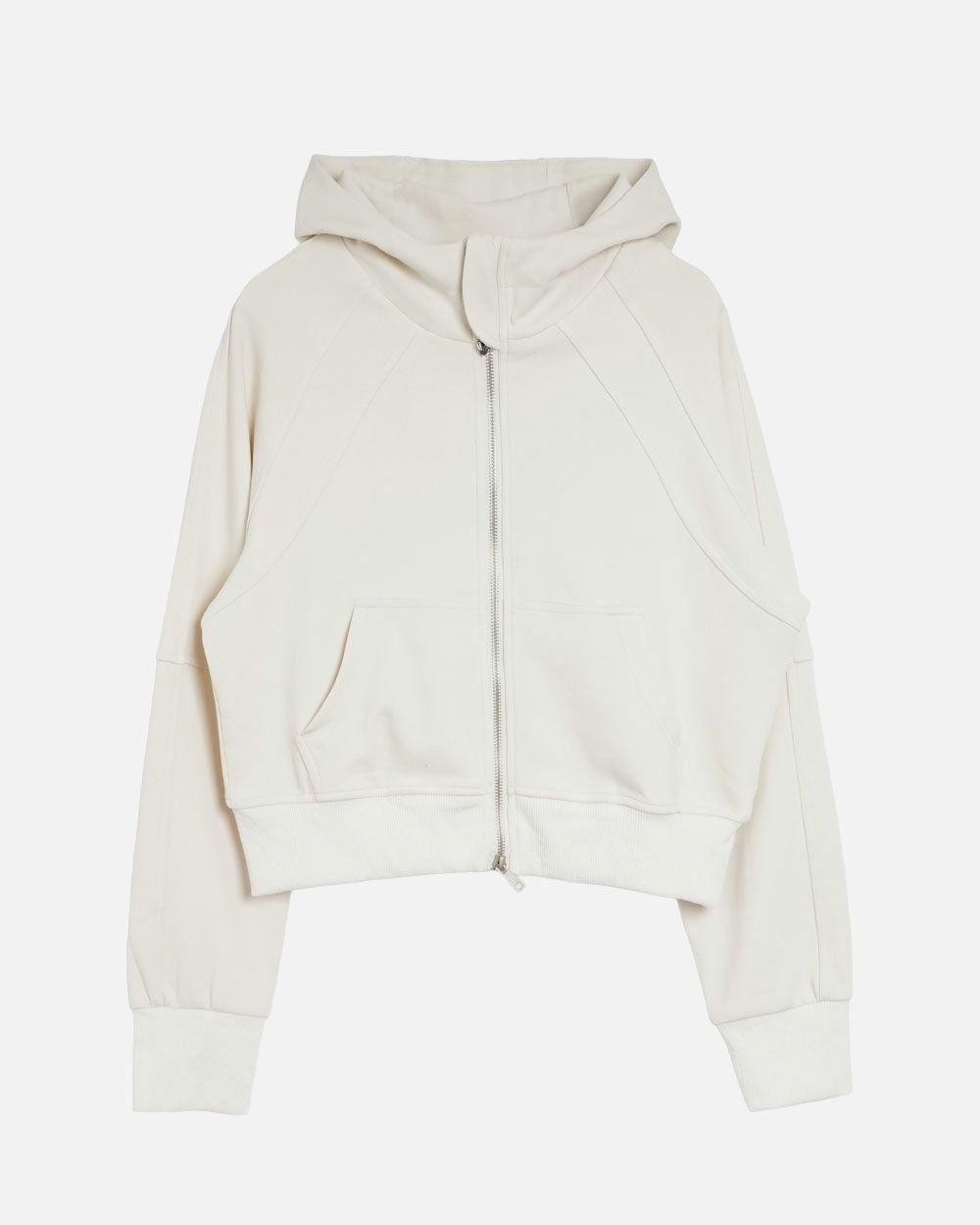 ジップアップフーディーとワイドパンツのバランスが、シンプルながら洗練された印象に。